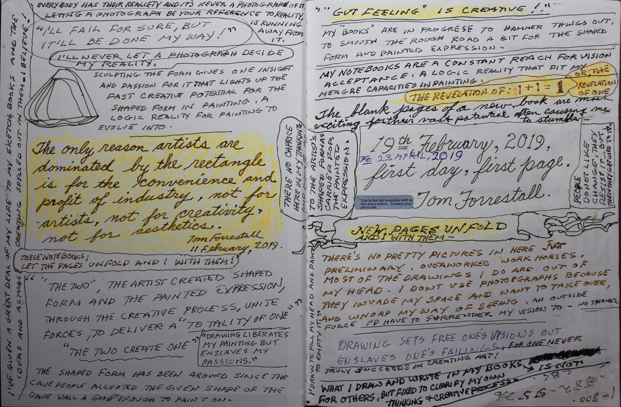 His notebooks are an important extension of his creative life and are central to his thinking. One subject that Tom and I have talked about for years is his interest in shaped paintings. He plays with these shapes in his notebook drawings. I am a sort of rectangle and square guy when it comes to the format of paintings—a traditionalist. We have argued about the subject for years and I must give Tom full credit for sticking to his guns and the results are there for all to see. The notebooks will certainly provide future art historians studying his work the foundations of his thinking on his shaped works.