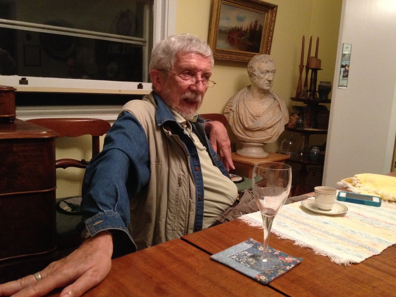 Last night at my regular Wednesday night salon, if you want to call drinking and eating with a bunch of friends, a salon, somebody remarked that the painting made me look like The Smoking Man in The X-Files. I don’t know if Stephen, who was there, took that as a complement, but I did. I like the idea of a man of mystery even if I stopped smoking fifty years ago. “Nothing interests me more than art. The rest is boring,” Stephen said just before he suggested a coffee break. He needed coffee to have the energy to paint and I needed to stay awake. It’s not that I was bored, but, being an old guy, I usually take an afternoon nap and if I sit too long I start to nod off. A break also gives me chance to see what Stephen has been up to.