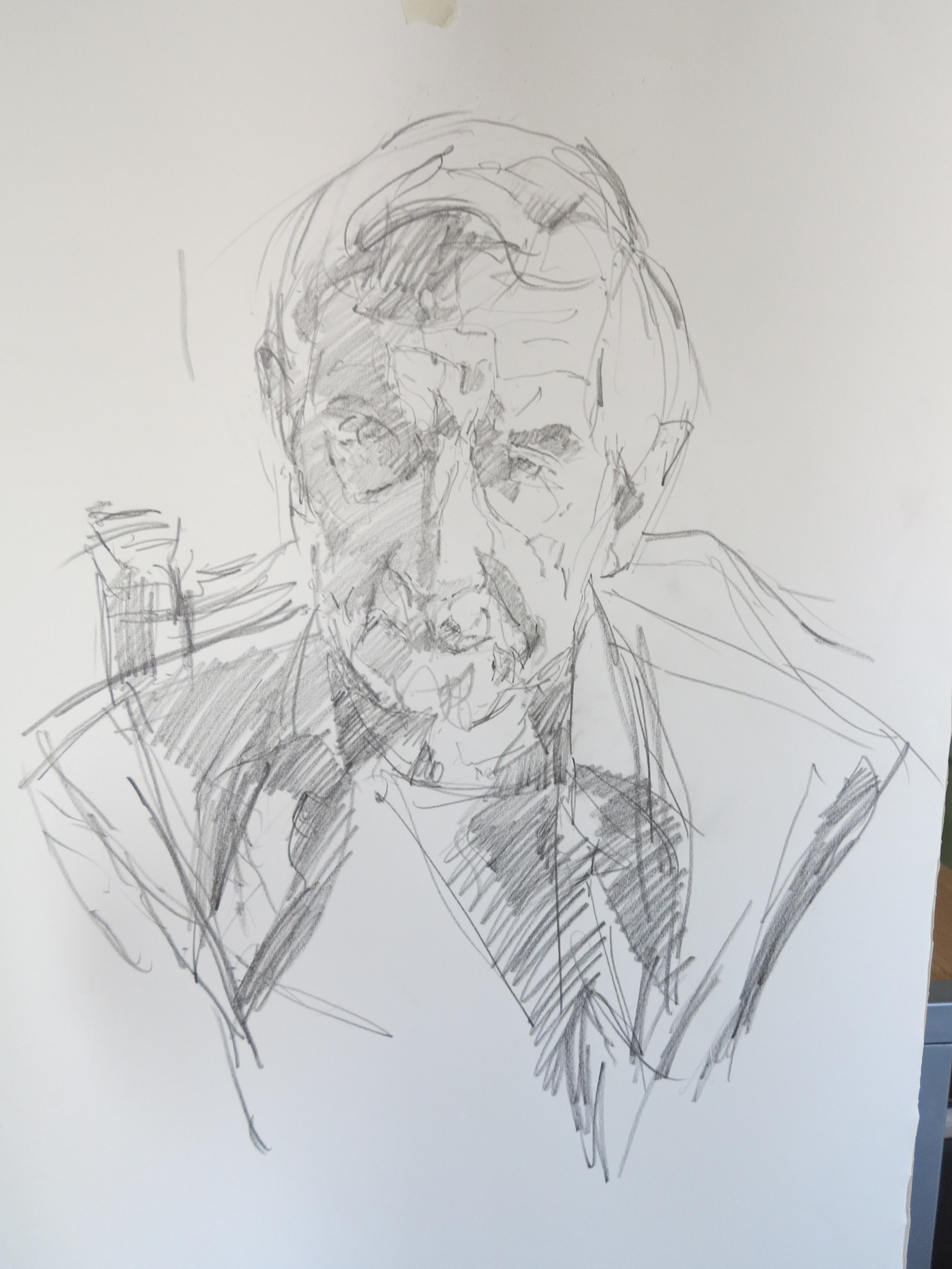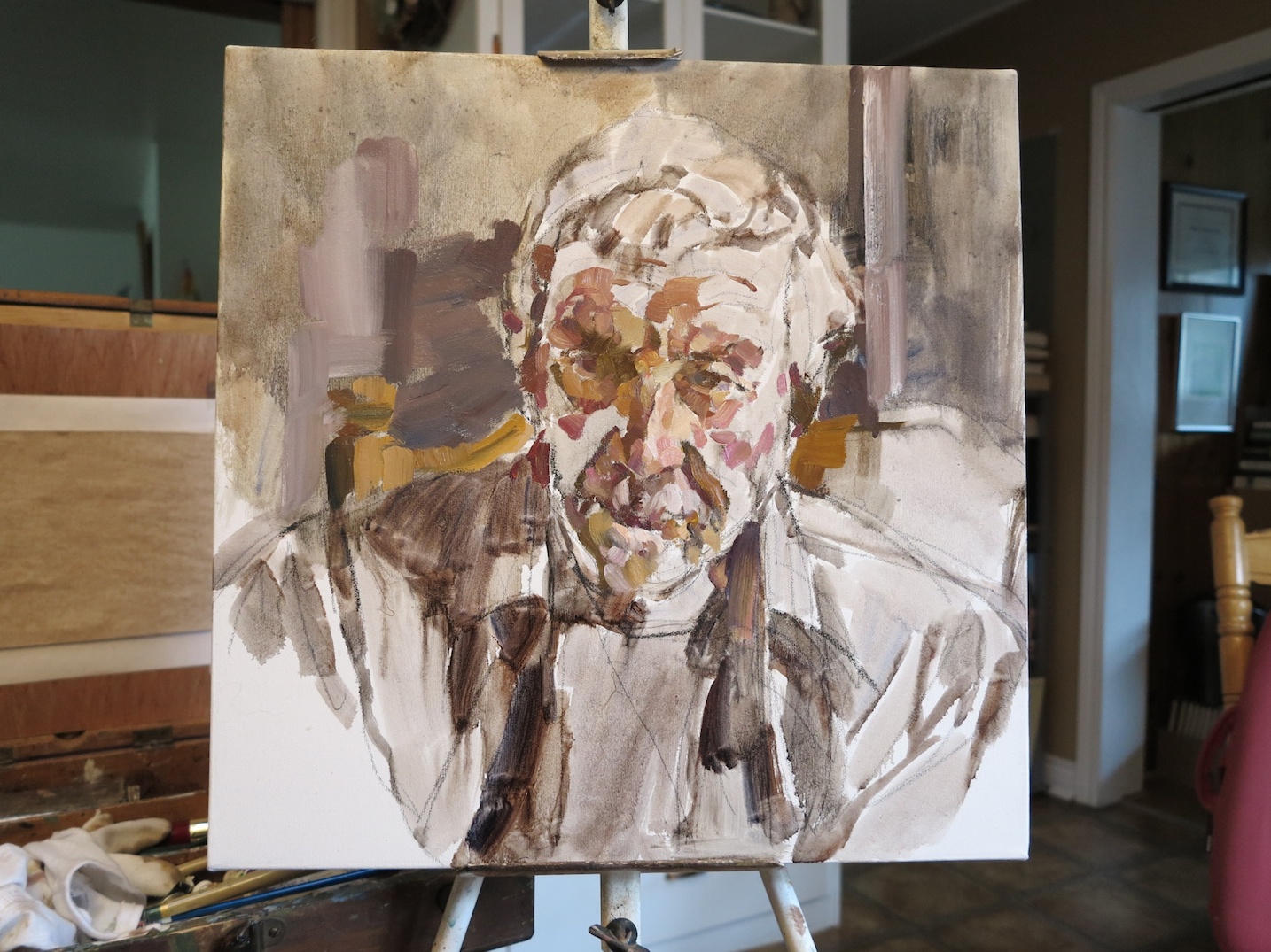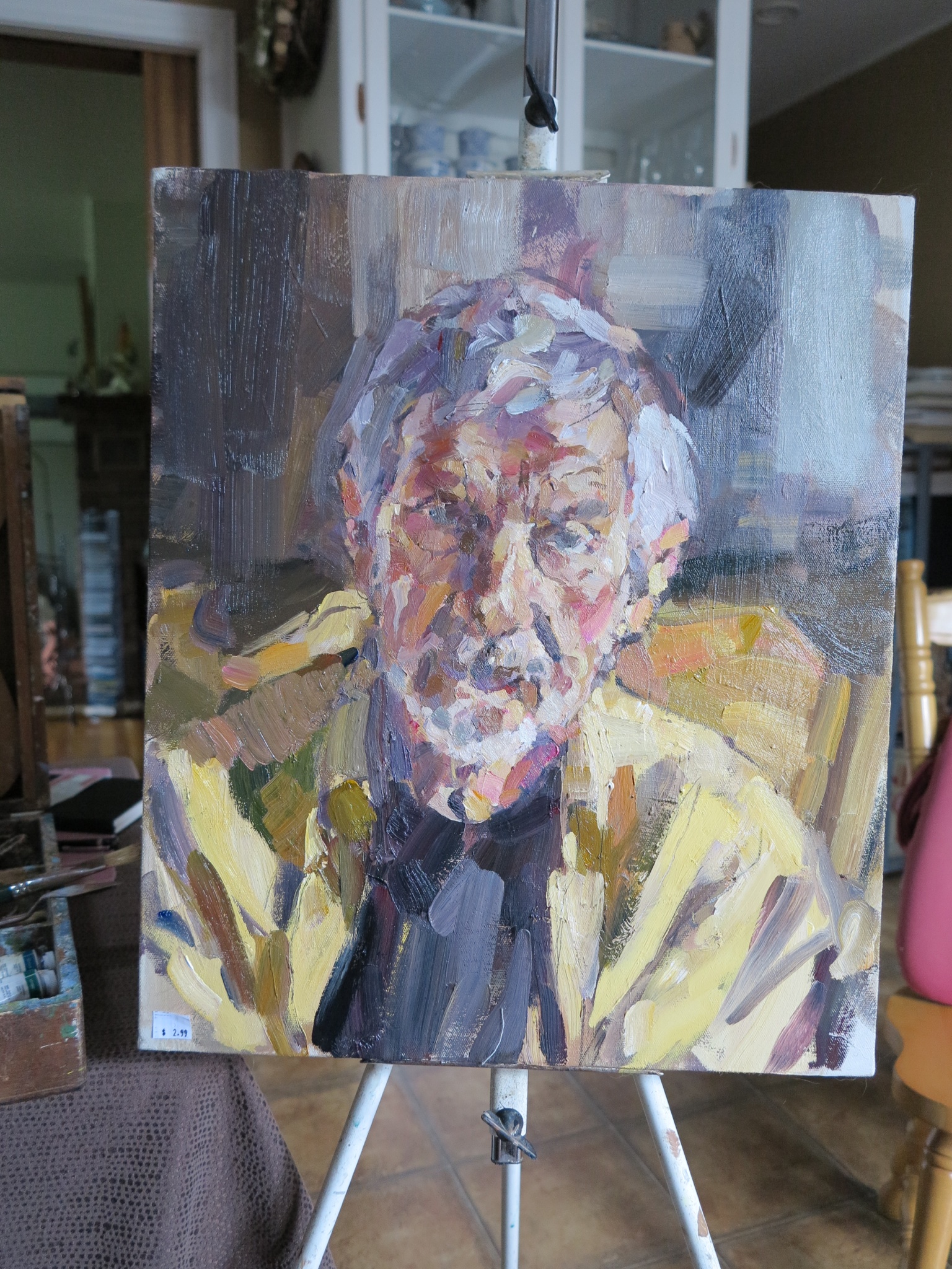 He started working on the first oil sketch, changing the shirt colour from red and blue to yellow, the colour of the shirt I was wearing today. We were talking about our idea of a new method of marketing his work and, perhaps, some other artists that we both knew using technology to reach a world wide market. “How do you think we should choose the artists?” I asked. “We need to start small. No more than three or four people,” he answered, “people we both know.”